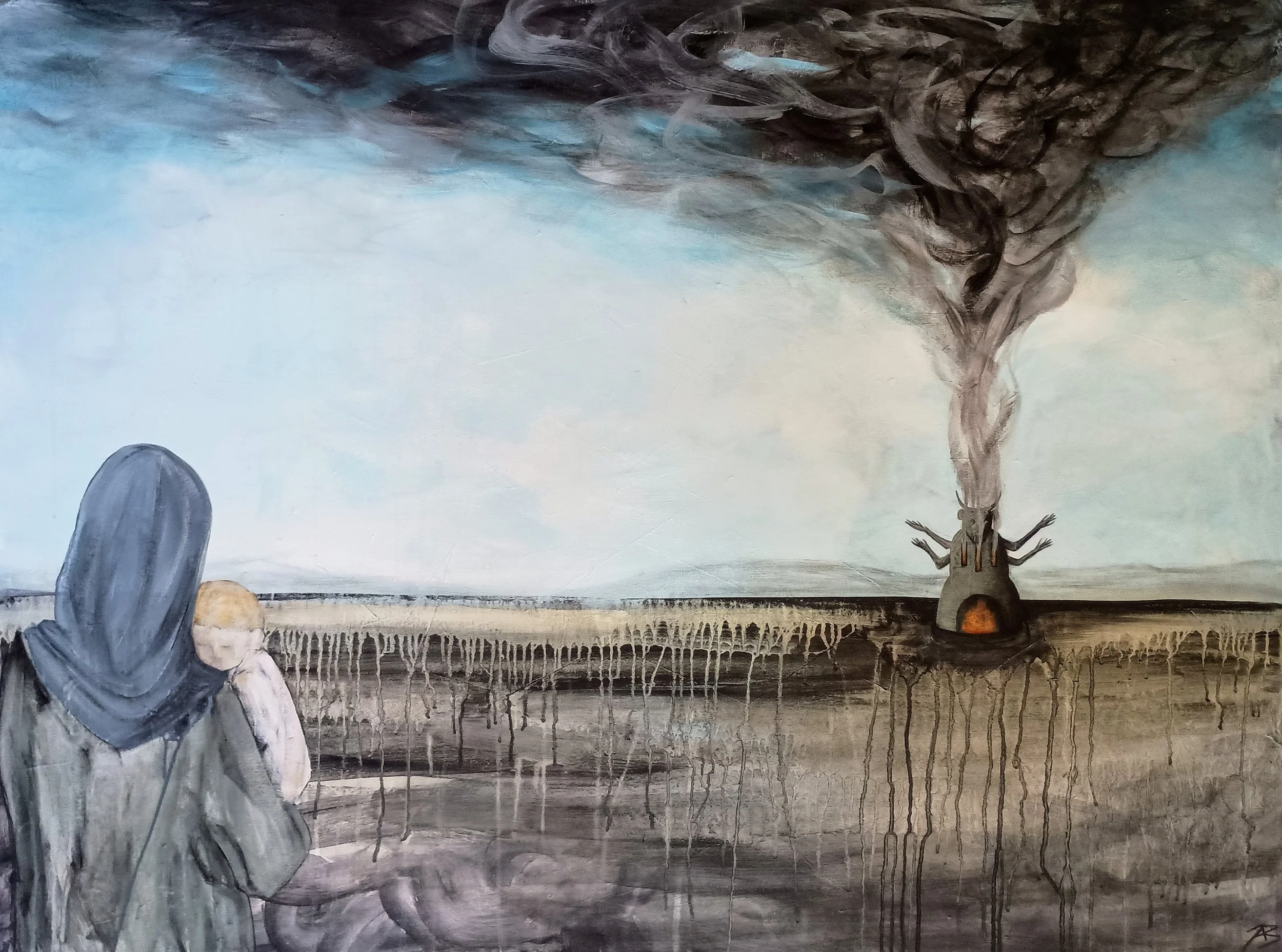 Art & Bee Homes For Sale › The Sacrifice Image 1 of 2 Image 2 of 2 The Sacrifice $800.00 Mother with child in front of Molech statue. 38x48x1.5 inches, sides are painted. Painted in 2026 by Brandon Allebach. Add To Cart Added! Mother with child in front of Molech statue. 38x48x1.5 inches, sides are painted. Painted in 2026 by Brandon Allebach.